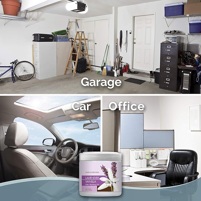 SMELLS BEGONE Air Freshener Odor Absorber Gel - Absorbs Odor from Bathrooms, Cars, Pet Areas, Boats and RVs - Made with Essential Oils - Lavender Vanilla Scent - 15 Ounce
