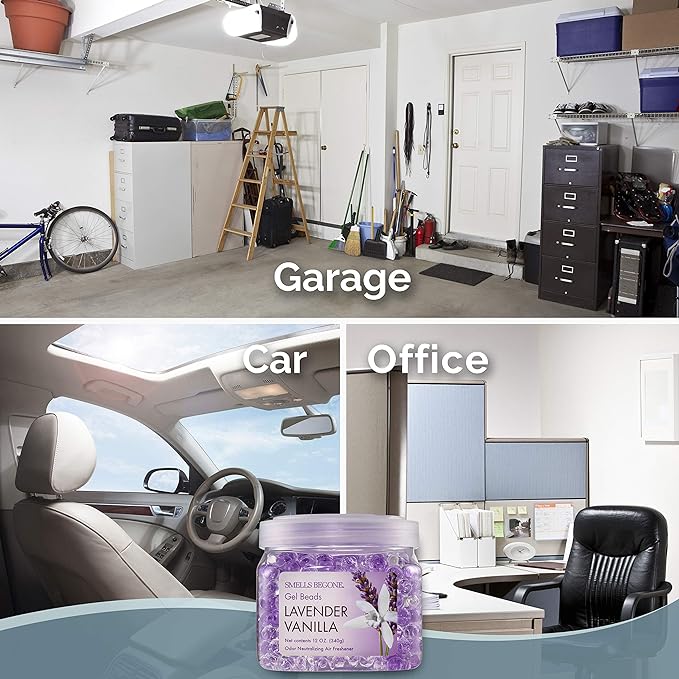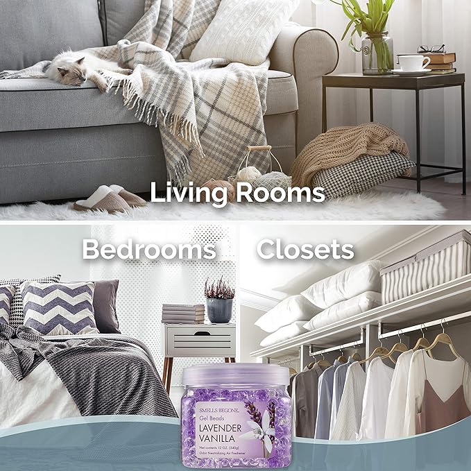 SMELLS BEGONE Odor Eliminator Gel Beads - Air Freshener - Eliminates Odor in Bathrooms, Cars, Boats, RVs & Pet Areas - Made with Essential Oils - Lavender Vanilla Scent - 12 Ounce