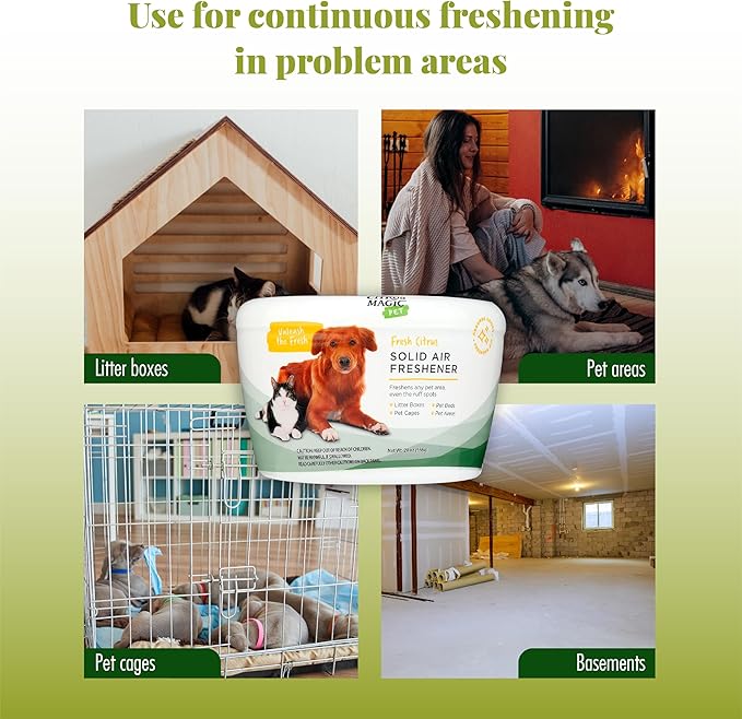 - PET ODOR NEUTRALIZER: Keep your home smelling fresh with the Citrus Magic Pet Solid Air Freshener. Our odor eliminator effectively absorbs and eliminates tough pet smells while leaving behind a clean, fresh scent.