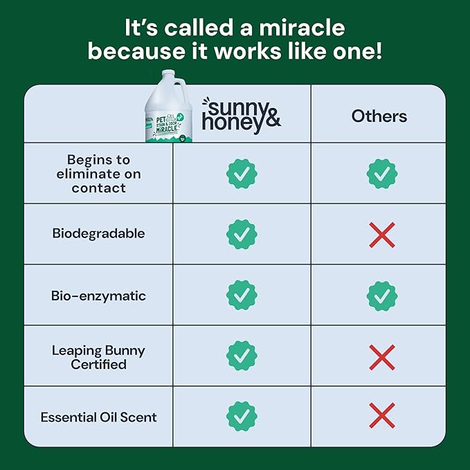 - Fresh Pet Clean: Meet Sunny & Honey's Pet Stain Miracle, the ultimate pet urine enzyme cleaner with a refreshing mint carpet cleaner scent. Perfect for tackling pet urine and keeping your home ready for holiday gatherings