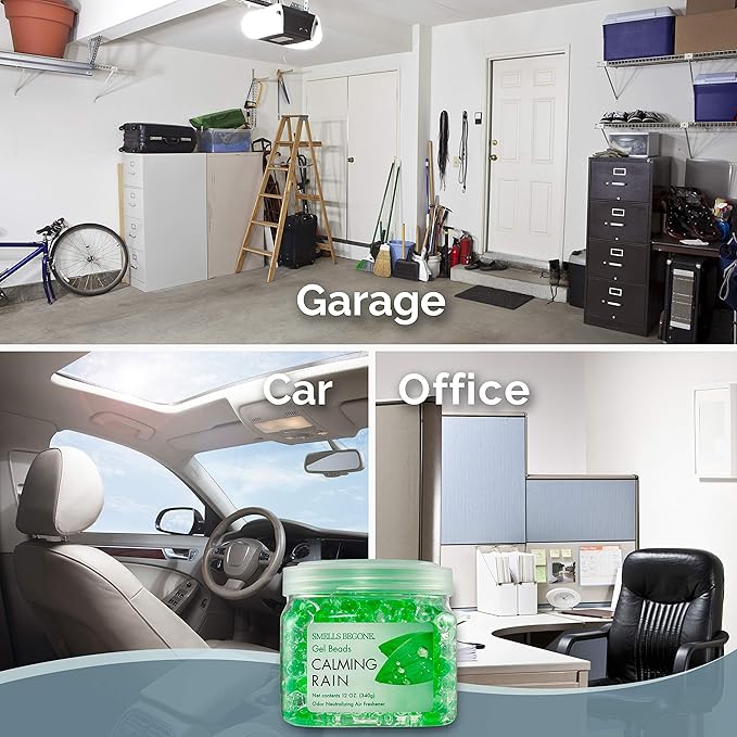 SMELLS BEGONE Odor Eliminator Gel Beads - 12 oz, Pack of 6 - Eliminates Odor in Bathrooms, Cars, Boats, RVs & Pet Areas - Air Freshener - Made with Essential Oils - Calming Rain Scent