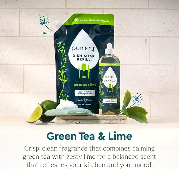 Puracy Natural Dish Soap Refill - Skin-Softening Plant-Based Liquid Dishwashing Detergent Soap, Clean-Rinsing Water-Sheeting Formula (Green Tea & Lime, 48 fl oz)