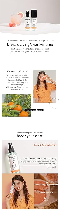 W.Dressroom No.51 Juicy Grapefruit Living Clear Perfume, Fabric & Room Spray, Water-Based Fresh Mist, Travel Size 2.36 oz