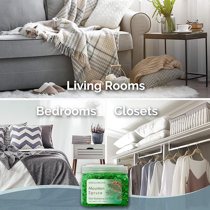 SMELLS BEGONE Odor Eliminator Gel Beads - Air Freshener - Made with Essential Oils - Eliminates Odors in Pet Areas, Bathrooms, Boats, RVs & Cars - Mountain Spruce Scent - 12 Ounce - 2 Pack