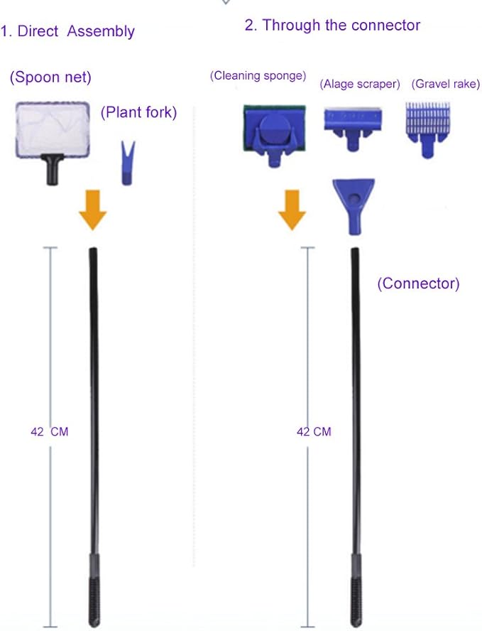 - 5-in-1 Aquarium Fish Tank Clean Algae Scrapers: With this versatile tool, you'll get five functions in one convenient device. It includes a fish net, gravel rake, algae scraper, fork, and sponge brush, making it easy to clean your fish tank thoroughly. Plus, it can be easily assembled and disassembled with the included strap, making it even more convenient to use.