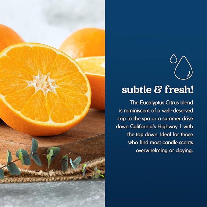 - The Eucalyptus Citrus blend is subtle and fresh, simultaneously reminiscent of a well-deserved trip to the spa or a summer drive down California's Highway 1 with the top down. Ideal for those who find most candle scents overwhelming or cloying.