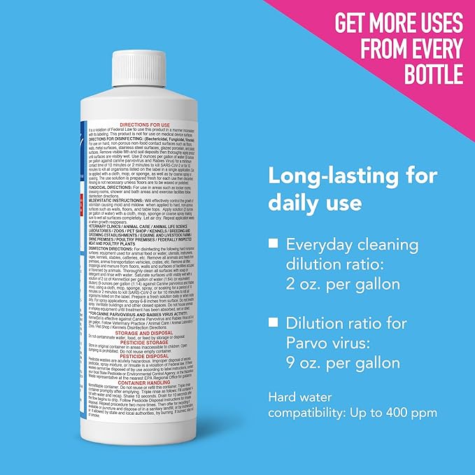 - Cost-effective and easy to use – Save time and money with a powerful cleaner, disinfectant that leaves behind a wintergreen scent! Simply dilute, apply, and leave the surface wet for 10 minutes to disinfect. No rinsing required, making it the perfect solution for daily kennel cleaning.