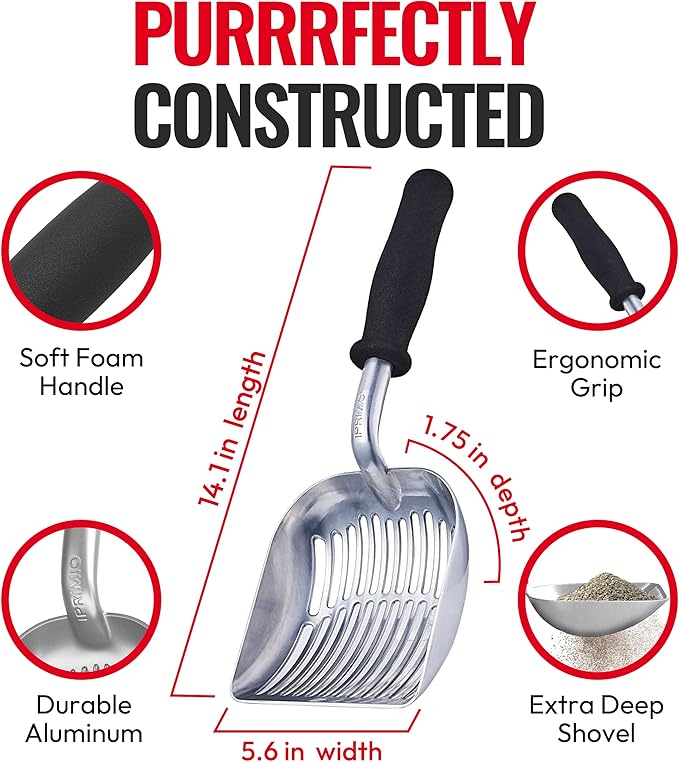 iPrimio Monster Silver Metal Cat Litter Scoop, Easy Grip Soft Foam Ergo Short Sturdy Handle, Super Large Non-Stick Deep Shovel, Fast Sifting, Kitty Litter Box Accessory, Suitable for Sore Hands