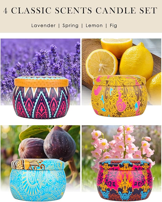- 【Four Magical Holiday Scents】- Each candle fills your home with soothing, cozy aromas: Lavender, Lemon, Mediterranean Fig, and Fresh Spring Aloha Orchid. These relaxing fragrances create a joyful, peaceful atmosphere — perfect for quiet evenings, family gatherings, or holiday celebrations.
