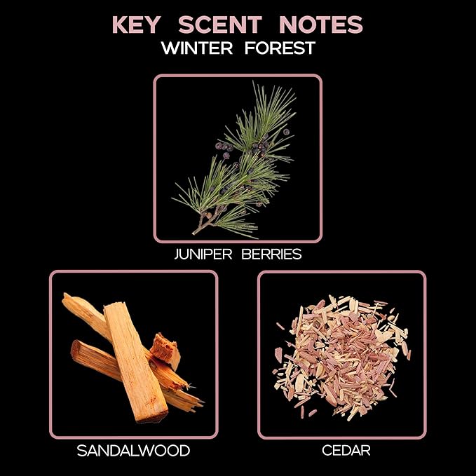 - WINTER FOREST – is a crisp 4oz diffuser oil refill with Fir Needles, Juniper, Sandalwood, and Cedarwood; evokes the scent of a peaceful, snow-dusted forest