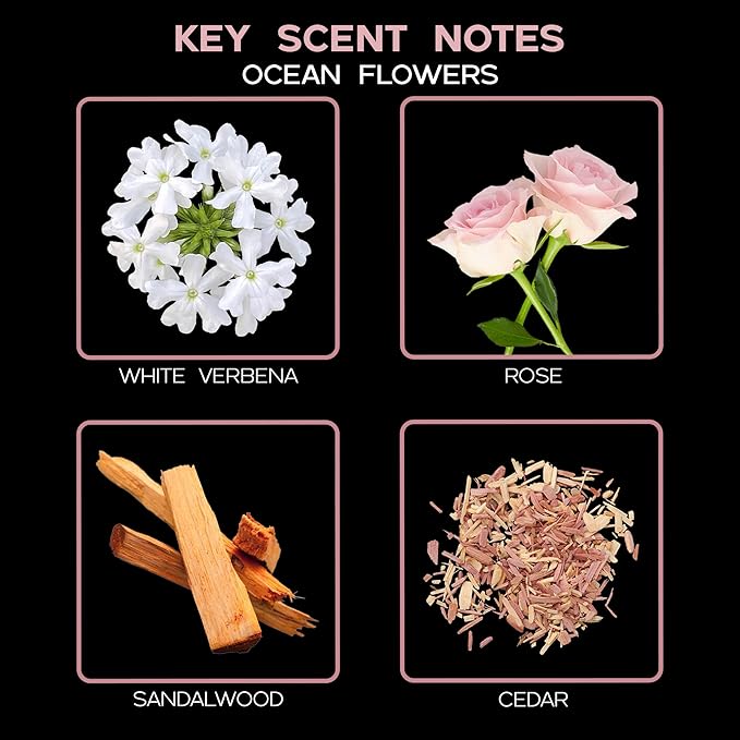 - OCEAN FLOWERS – is a refreshing 4oz diffuser oil refill featuring Verbena, Juniper, Lily, Rose, Sandalwood, and Cedar; evokes a coastal floral breeze