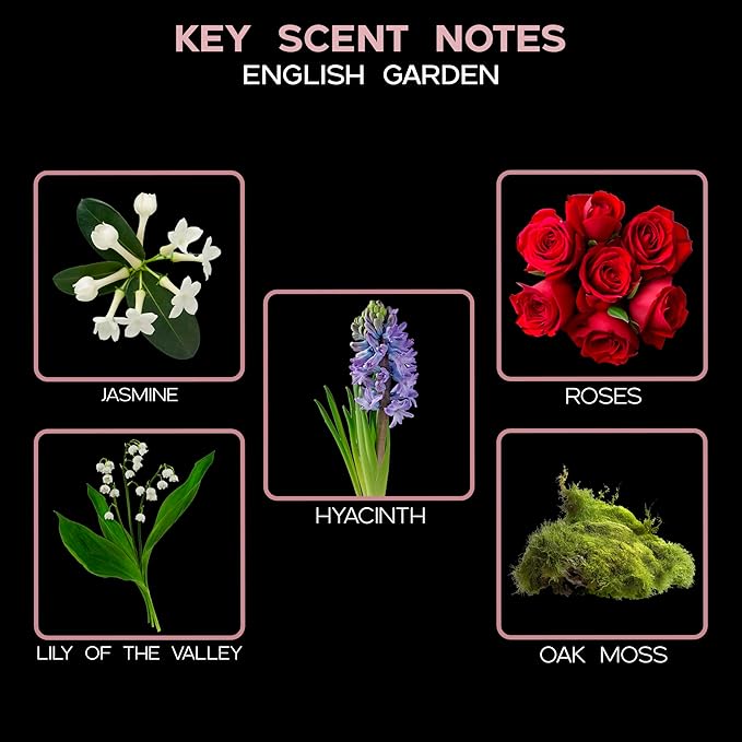 - ENGLISH GARDEN – is a lush 4oz diffuser oil refill with Jasmine, Rose, Hyacinth, and Lily of the Valley; fills your home with the essence of a blooming spring garden; perfect for entryways, bathrooms, and living areas