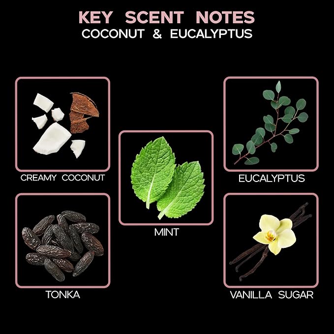 - COCONUT & EUCALYPTUS – is a soothing 4oz diffuser oil refill with Coconut, Eucalyptus, Mint, Tonka, and Vanilla Sugar; balances tropical sweetness with refreshing herbal notes