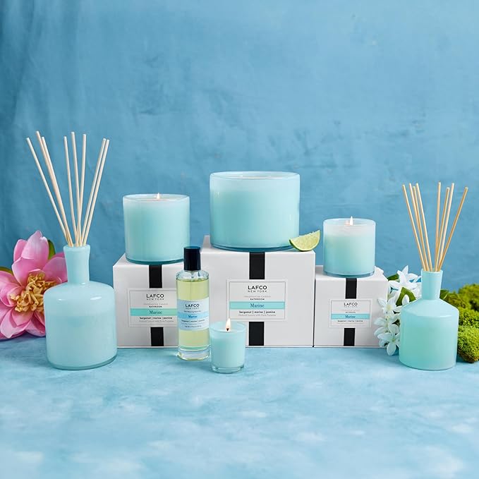 - HOUSE & HOME COLLECTION - Our House & Home collection transports you to a room, setting, or destination through the combination of scent, color, and design. The Marine candle evokes the mood of being in a Bathroom.