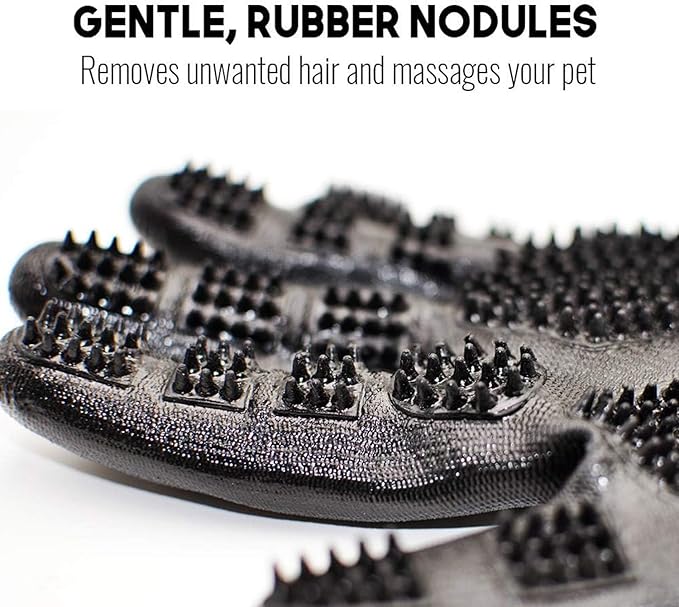 - 🧤 Control & Comfort: The five-finger design gives you full mobility while grooming your pet. It imitates the act of petting your pet and they will feel more comfortable while getting groomed. These grooming gloves are one size fits all and can be adjusted with a velcro strap. The rubber nodules are gentle on your pet’s skin, but sturdy enough to de-shed effectively.