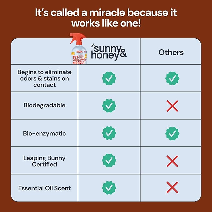 - Pet Cleanup Made Easy: Sunny & Honey's enzyme cleaner tackles pet accidents head-on, making cleanup a breeze. Whether it's a dog pee cleaner or a cat pee remover you need, this pet spray is your go-to for freshening up your home