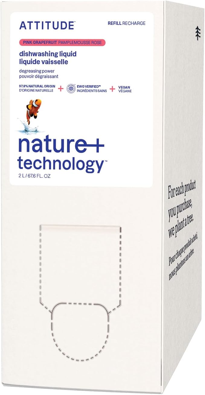 ATTITUDE Dish Soap Refill, EWG Verified, Plant-Based & Vegan Dishwashing Liquid, Naturally Derived, Pink Grapefruit, 67.6 Fl Oz