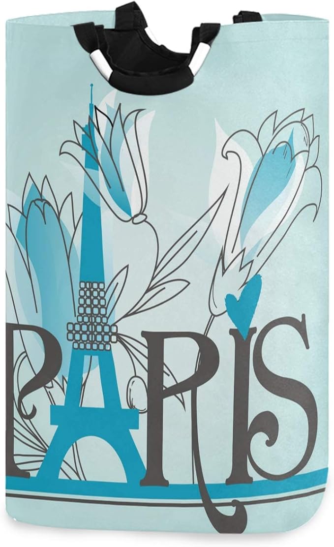 visesunny Paris Letters Blue Pattern Large Laundry Hamper with Handle Foldable Durable Clothes Hamper Laundry Bag Toy Bin for Bathroom, Bedroom, Dorm, Travel
