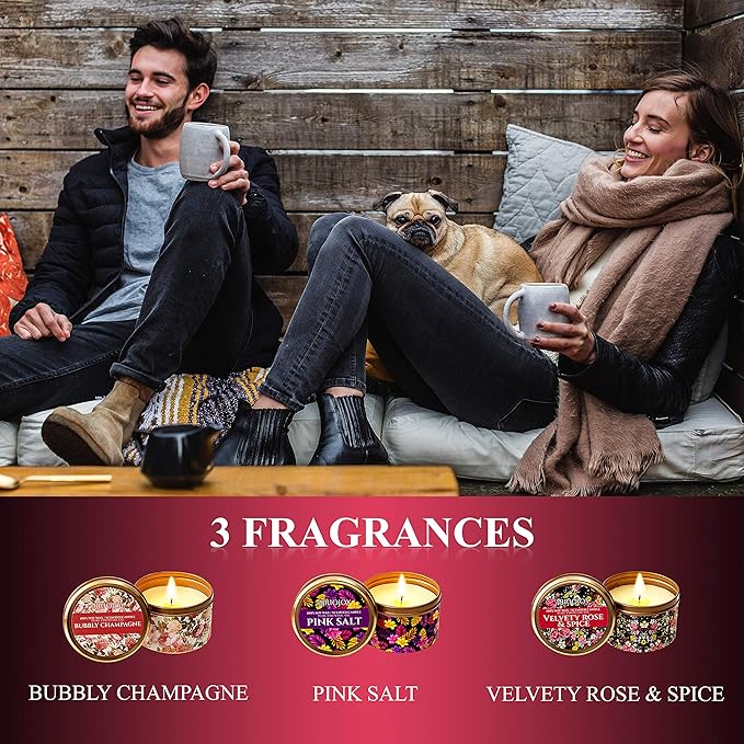 - 🌺 SWEET AND UNIQUE SCENTS: Add a soothing effect and create a cozy and intimate atmosphere in your space with our romantic candles that come in pink salt, bubbly champagne, and velvety rose & spice scents. Each 3-6 ounce essential oil candle burns for 30-35 hours—a total of 90-105 hours of restorative fragrance.