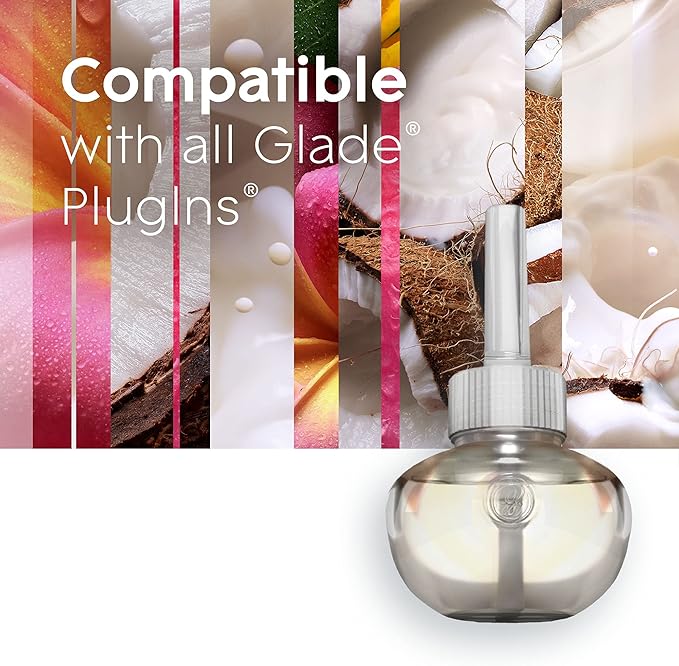 - One 5 count pack of Glade PlugIns Air Freshener Refill, Exotic Tropical Blossoms scent, allows you to enjoy the tropical home fragrance of Monoi Blossoms, Melon and Coconut Milk (Packaging May Vary)