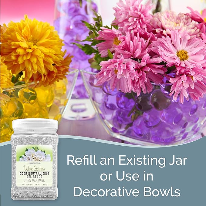 SMELLS BEGONE 48 oz Odor Eliminator Gel Bead Refill - Eliminates Odors from Bathrooms, Cars, Boats, RVs and Pet Areas - Air Freshener - Made with Essential Oils - White Gardenia Scent