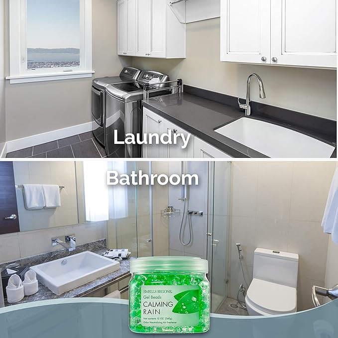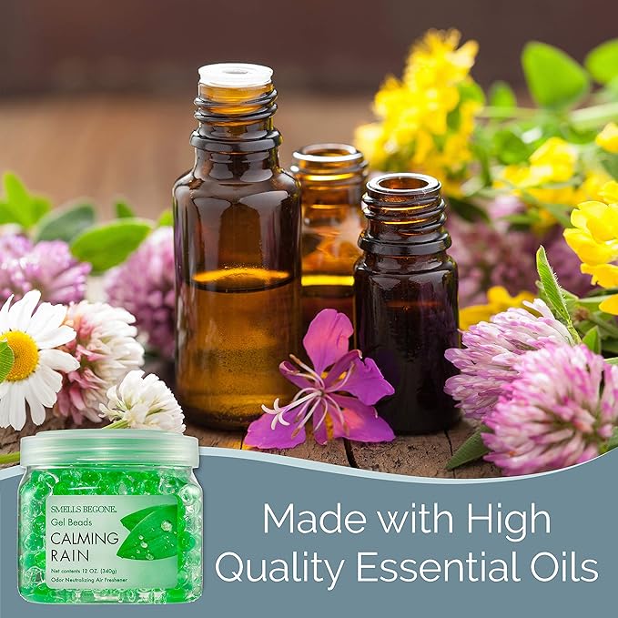 SMELLS BEGONE Odor Eliminator Gel Beads - 12 oz, Pack of 2 - Eliminates Odor in Bathrooms, Cars, Boats, RVs & Pet Areas - Air Freshener - Made with Essential Oils - Calming Rain Scent