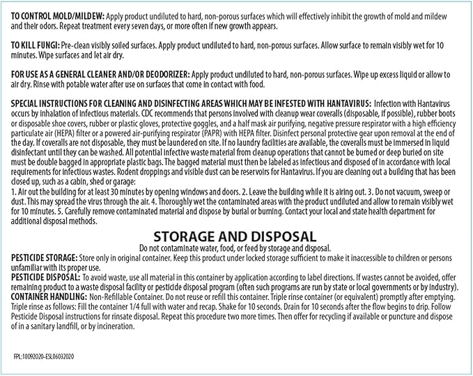 - FUNGICIDAL & MILDEWSTATIC PERFORMANCE: This product kills the following fungi in 10 minutes on hard, non-porous surfaces with 5% soil: Candida albicans, Trichophyton interdigitale (formerly T. mentagrophytes) (Athlete’s foot fungus a cause of Ringworm) MILDEWSTATIC PERFORMANCE: This product controls the following mold for 7 days on hard, non-porous surfaces with 5% soil: Aspergillus niger.