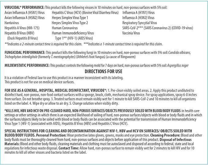 - Specific Uses For Product : Hospital Disinfectant and Virucide**, Non Porous Surfaces, Porous Surfaces