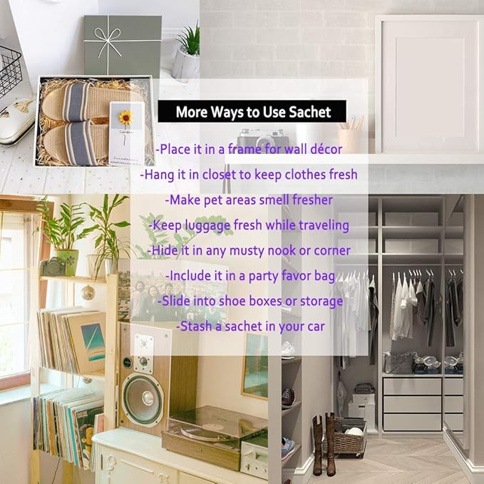 - Muliti-Use In House: Perfect Air Freshener for any space that needs a freshness boost! This air freshener bags pack with a drawstring design makes it easy to place anywhere. Hang them in your closet, place them in drawers, tuck them into shoes or gym bags, hang from the car mirror, or refresh the bathroom and office. or Use these versatile sachets in your luggage, pet areas, storage bins, and under furniture. Keep every corner of your house, home, room smelling fresh and inviting