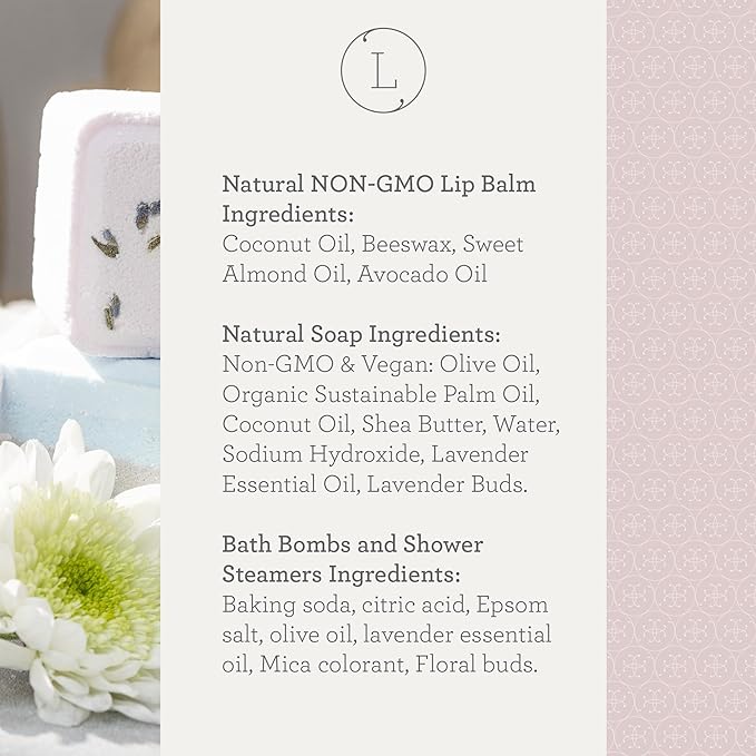 - COMPLETE 7-PIECE SET: Includes Lavender natural soap bar, Clay facial mask, Natural lip balm, Eye mask, Soap saver, Shower steamer, and a Scented candle – all elegantly arranged in a gorgeous gift box.