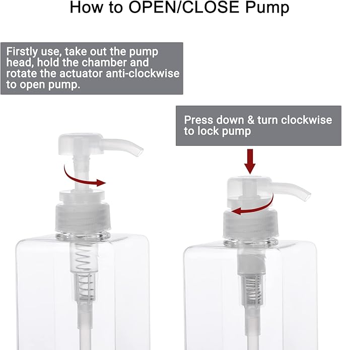 - Leak-Proof - Press down and twist clockwise to close the pump dispenser bottle, preventing the lotion from leaking. Then twist anti-clockwise to open and use.No worry of lotion leakage!