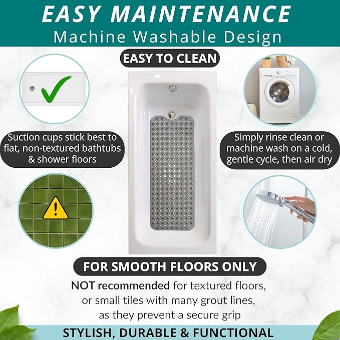 - Enjoy 360-degree Protection In or Out of Your Bathtub: with a premium manufacture bathmat, made of top standard anti slip material. It is a MAXIMUM grip tub/shower mat with 200 well-placed suction cups, for max sticking capacity.