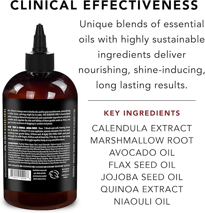 - THE SENSITIVE ONE SHAMPOO: Formulated with ingredients aimed to soothe and regulate the skin and follicles of these gentler souls so they can get to the business of dogging in comfort + peace.