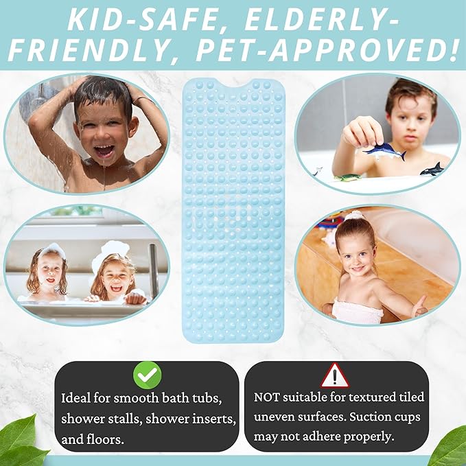 ENKOSI Bath Mat - Large Non Slip Bathtub & Shower Mat - Extra Long 40 x 16 Inch Bathroom Mats for Tub Nonslip Anti Slip Bathmats (40x16 Light Blue 1-Pack)