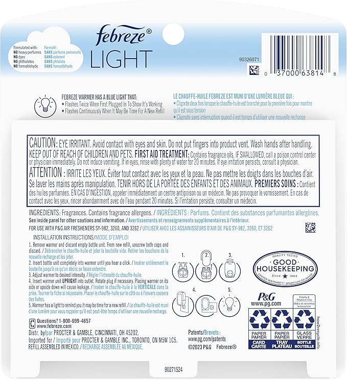 - Contains (2) Febreze LIGHT scented oil refills for Febreze Fade Defy PLUG