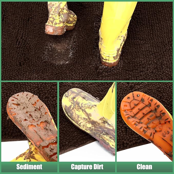 - [Powerful Dirt Scraping and Moisture Locking] This chenille doormat outperforms ordinary options in trapping dirt and moisture, stopping tracked-in mud, rainwater, and debris from ruining your floors. It shines even brighter in winter! Step on doormat, and the textured, dense surface instantly scrapes off dirt and snow from shoe soles, while absorbent fibers lock in moisture. Melting snow from boots is soaked up immediately—no slush puddles or slippery spots for kids, pets, or elders.