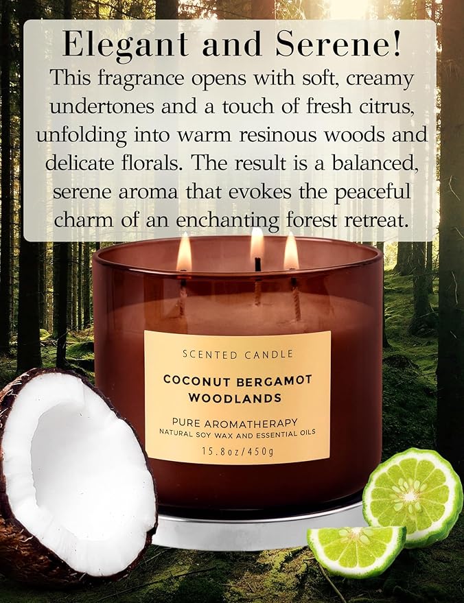 - 🕯️ Need a moment to unwind? Surround yourself with the warm, tranquil aroma of our Coconut Bergamot Woodlands 3-Wick Candle a smooth blend of coconut, bergamot, amber, balsam, jasmine, tuberose, and ylang-ylang. It’s an elegant balance of creamy, floral, and woodsy notes that feels like a quiet retreat in nature.