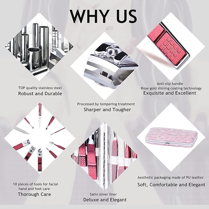 Manicure Set 10 in 1 Stainless Steel, Nail Clippers Scissors Pedicure Tools Kit - Portable Travel Grooming Kit for Men and Women with Leather Case (Rose Red)