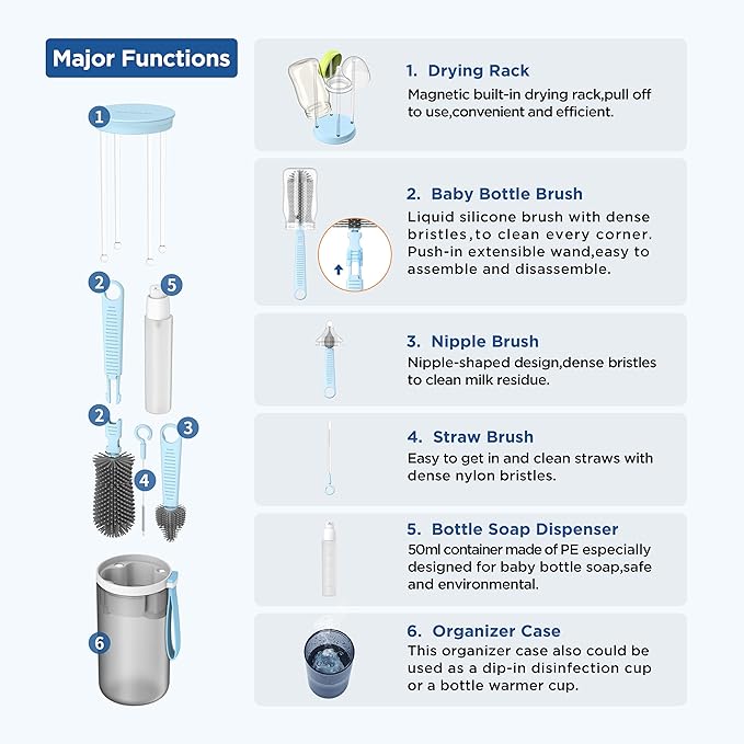 - ✈【On The Go Baby Bottle Brush Set】This baby bottle brush travel kit has a 6 in 1 design which features a 9.8" baby bottle brush with an extendable wand, a 5.5" nipple brush, a 5.1"straw brush, a 5.9"baby bottle drying rack, a 1.7oz baby bottle soap dispenser and a container case. This liquid silicone brush set is more hygienic than easy-to-mold and hard-to-dry sponge brushes. Durable silicone bristles are scratch-free yet soft.
