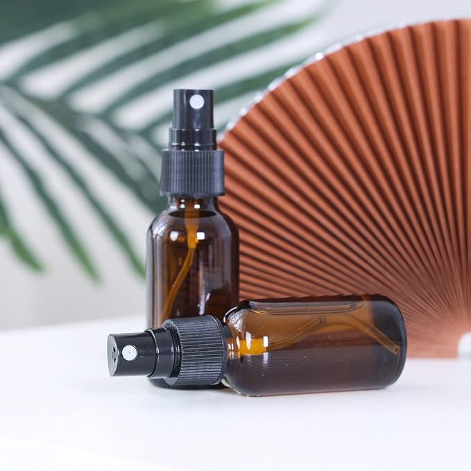 2oz Glass Spray Bottle, Fine Mist Boston Glass Bottles with Black Fine Mist Sprayer Small Clear Bottles for Essential Oils, Bath, Beauty, Hair & Cleaning, Amber, Pack of 48