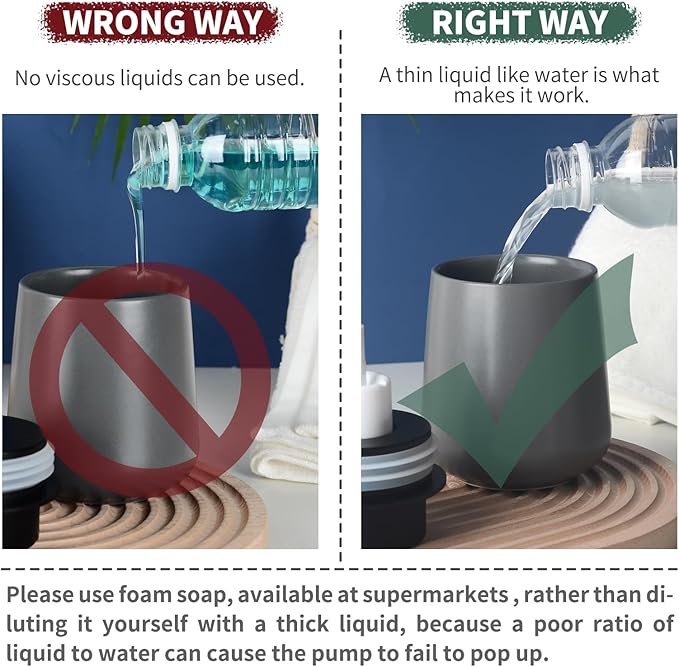 - Multi-Use: Grey ceramic soap dispenser used for foaming soap filler, If you use viscous liquids such as liquid soap, dish soap, or shampoos, it's recommended to dilute them with water to achieve a rich lather; refillable for continuous use