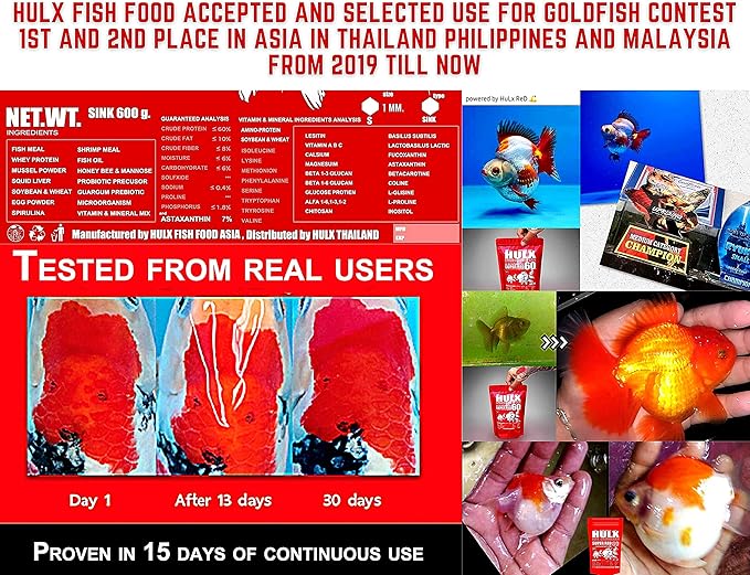 - HEALHY FISH FOOD: HULX You can see the difference in just 15 days of usage. From thin Body to Fat & Big Muscle Body, Good Health, Very Fast Growth up more 2 inch (5.5 cm.) in just 30 days. It enhances the color Beautifully & make them Shine.