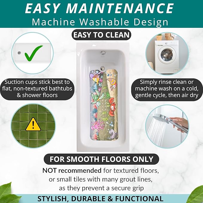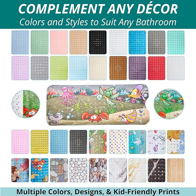 - EXTRA-LARGE SIZE Measuring an extended 40 x 16 inches, our long, kid-friendly bath mat guarantees maximum coverage. Many other mats are thinner and smaller, leaving areas of your tub exposed. Our secure suction cup durable mat is a versatile and essential accessory for any family bathroom.