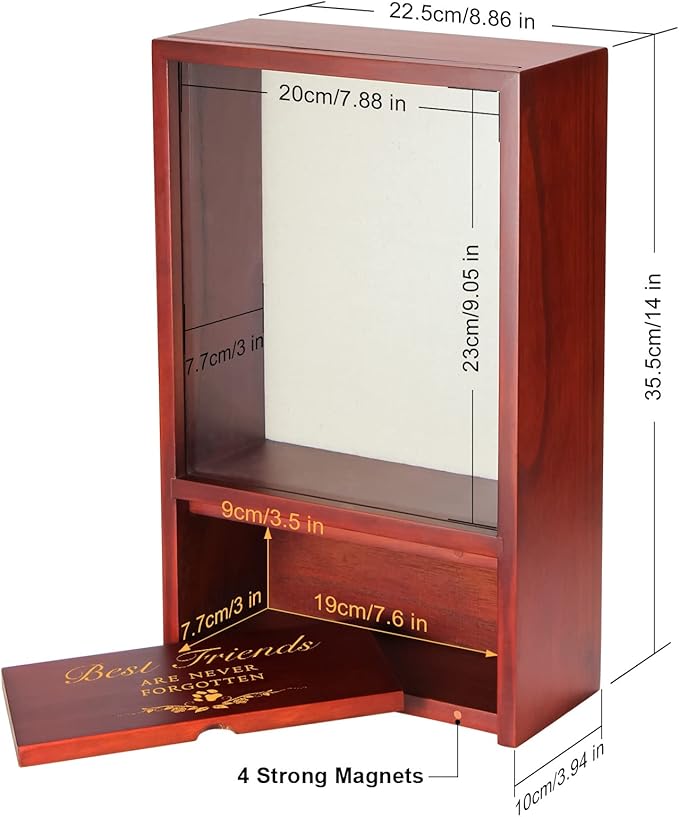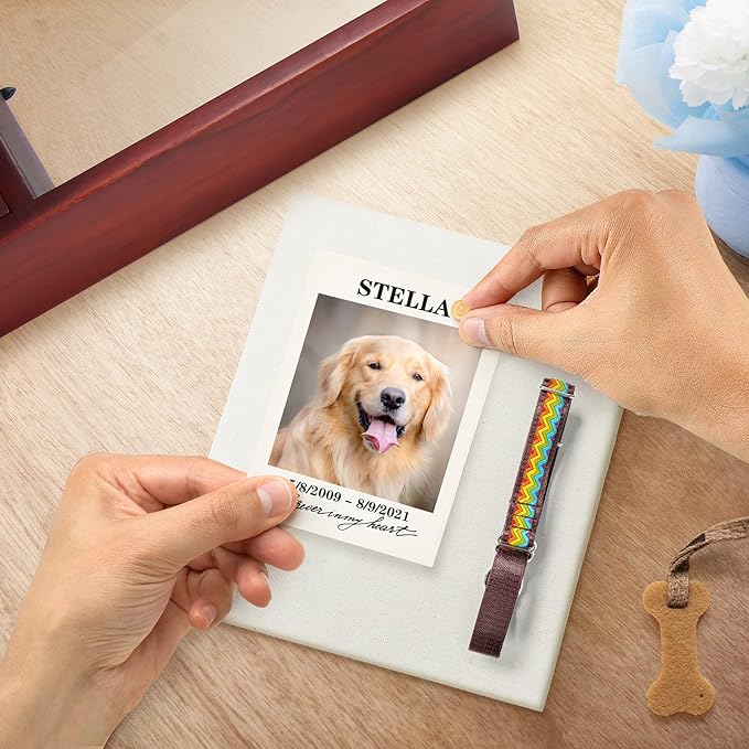 - Perfect for Memorabilia - This heavyweight, brown wooden urn comes with an 8’ ’x 10’’ display frame, which can hold your dog’s favorite toys, clothing, a collar or leash. The box will also give you a way of returning to the memorabilia during those occasions in which you want to revisit and remember the wonderful times and memories you had with your cherished pet.