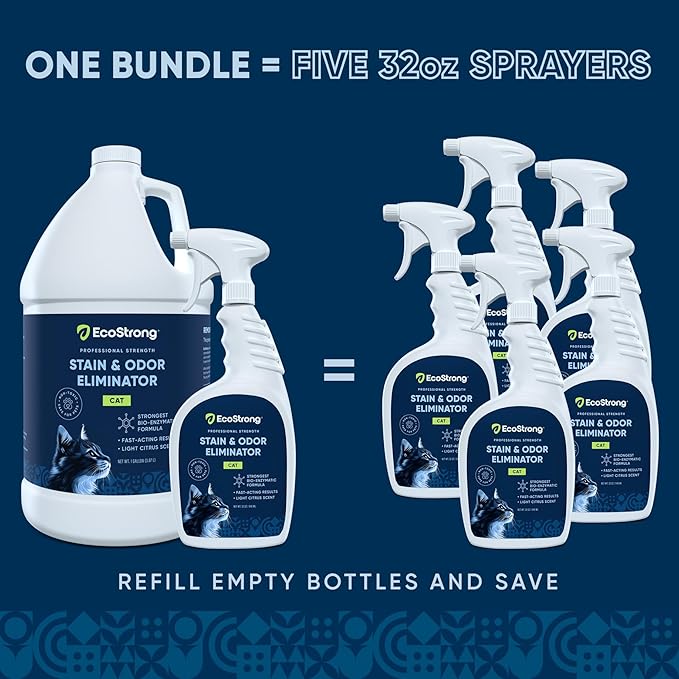 Eco Strong Cat Stain and Odor Remover| Enzyme Urine Odor Neutralizer - Stain Remover for Carpet, Litter Boxes, Bedding, and Laundry [160 Fl Oz Bundle]