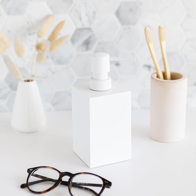 Matte White Soap Dispenser for Bathroom, 15oz Square Rustproof Liquid Hand Dish Soap Dispenser Pump for Kitchen Sink, Countertop, and Bathroom