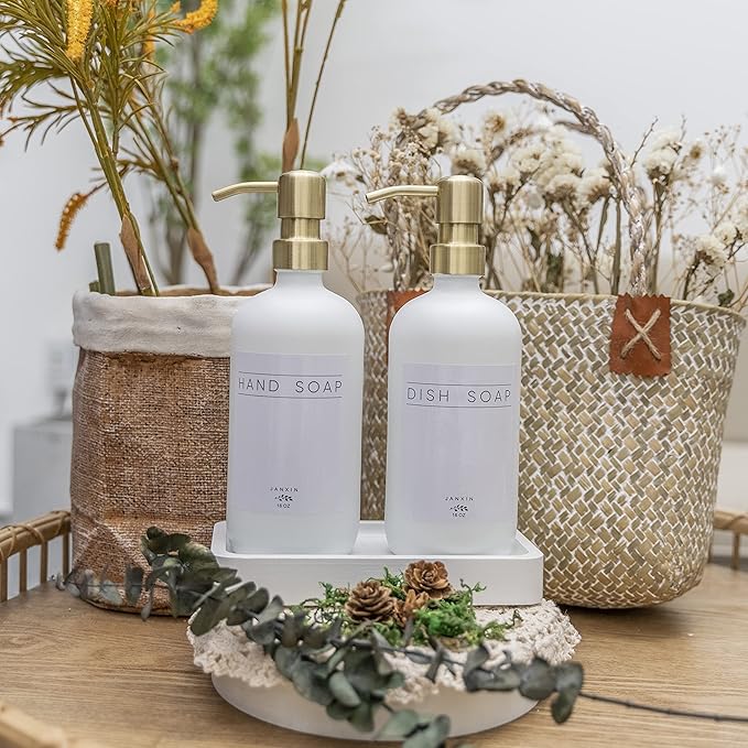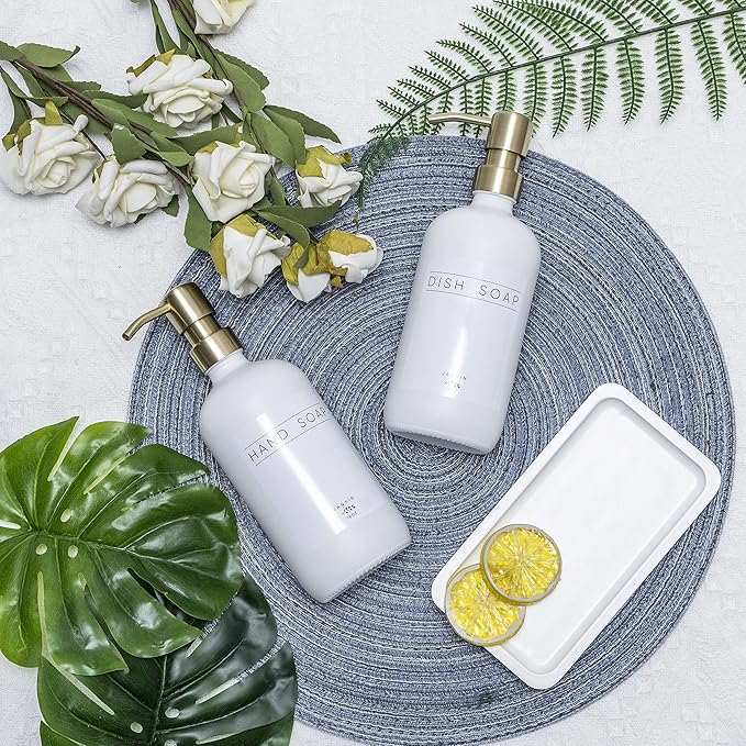 - Value Soap Dispenser Set-Include 2 Pcs 16 Oz thickened BPA free white glass bottles with gold stainless steel Pump,1 hand-made wood soap dispenser tray,1 collapsible silicone funnel,5 premium waterproof labels (Hand Soap, Dish Soap, Lotion, Shampoo, and Conditioner)