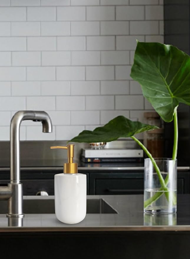 White Liquid Soap Dispenser with Golden Pump for Bathroom,Kitchen Refillable Dispenser,Countertop Lotion Ceramics Hand Dispenser 420ml (Cylindrical White Bottle)