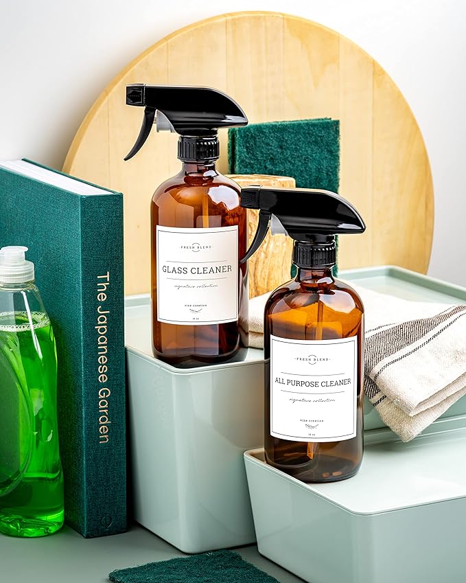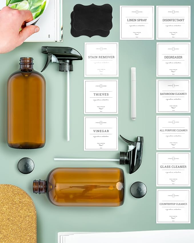 - PREMIUM WATERPROOF LABELS - Ten elegant high-end labels included: glass cleaner, countertop cleaner, vinegar, all purpose cleaner, thieves, bathroom cleaner, degreaser, disinfectant, linen spray, and stain remover. Durable and waterproof for daily use. Additionally two chalk labels for any other needs, white marker is included. Premium Labels measurement 3" x 3".