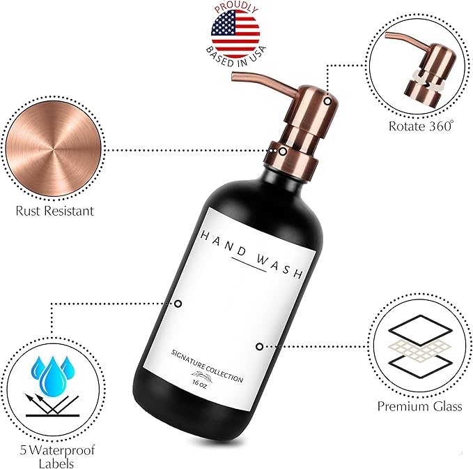 - ✅ 2-in-1 COMBO: Upgrade your home with our glass soap dispenser set. The dish soap dispensers are crafted from the highest quality glass and can be used as soap dispensers for kitchen sinks, soap dispensers for bathrooms, or as hand soap dispenser of your favorite liquid. The kitchen soap dispensers come with 2 dish soap dispensers for kitchen bottles (16 ounces), 2 stainless steel pumps, and 5 waterproof labels. Our selection includes colors including amber, clear, white, and black.